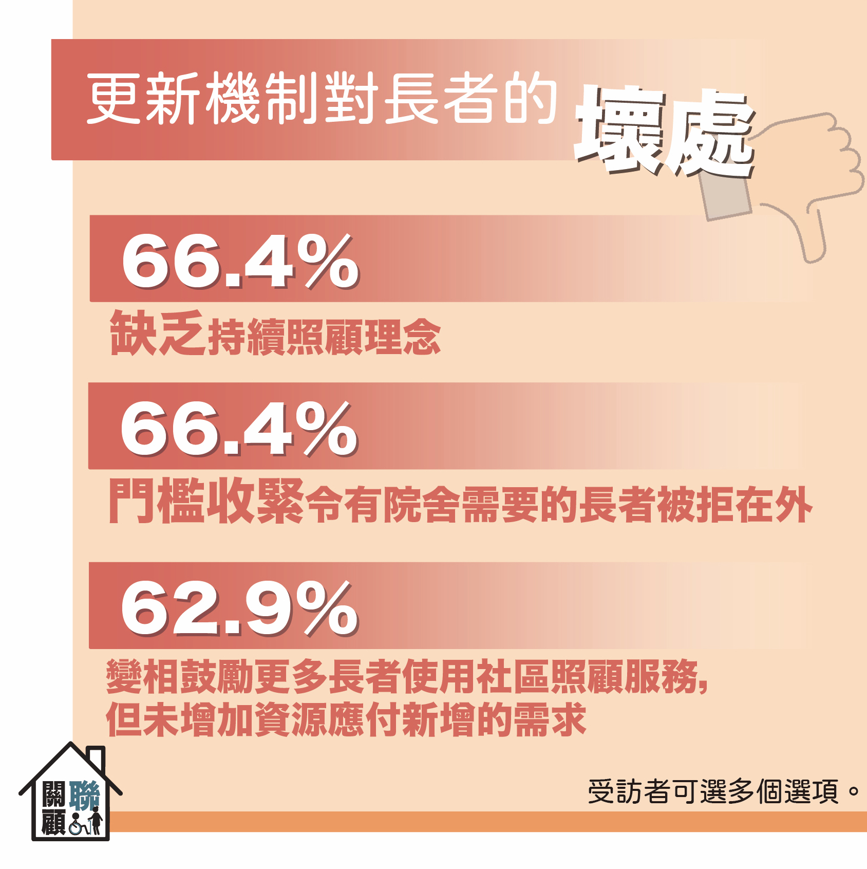 故此,關顧聯於2021年1月至3月間進行問卷調查,收集及了解同工及評估員對機制評分準則的意見、看法,得出同工於三大範疇下的意見:1. 新機制評分準則、2. 更新機制對長者帶來的好與壞 及 3. 對政府同步需推出的政策的意見 ,並作出建議,讓社會各界關注安老規劃及制度,冀望政府能聆聽同工的意見。