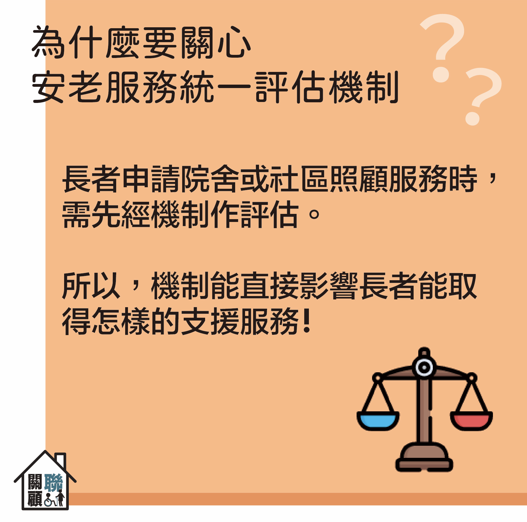 有見社署現正籌備安老服務統一評估機制(下稱機制)^更新,並已鐵定於本年8月正式推行。新機制中,更新了當中的計分方法及準則,直接影響有需要的長者能否取得支援服務,取得服務的種類,如社區支援或院舍服務等,不少長者及同工均就此表達擔心。